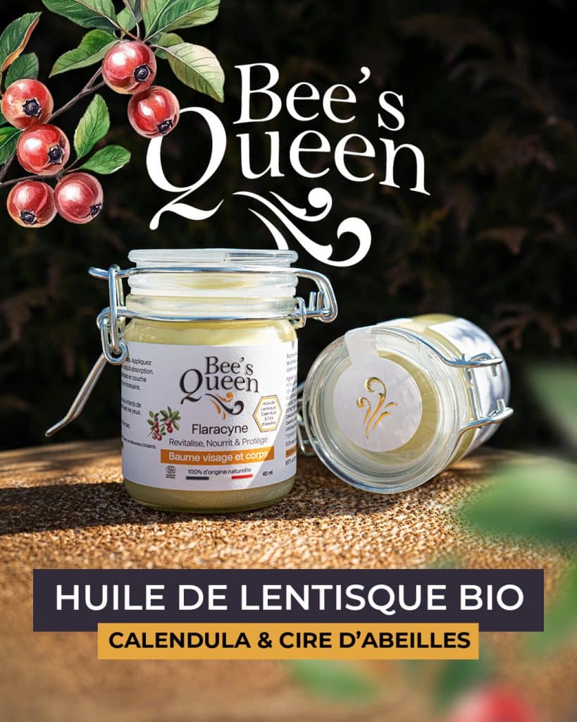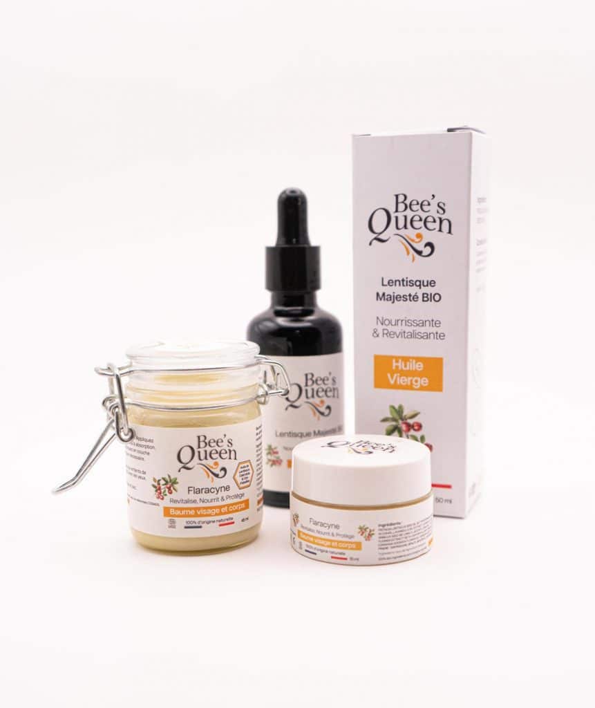 Bee’s Queen mise sur l’huile de lentisque, un ingrédient rare à vertus apaisantes, régénérantes et protectrices, comme base de ses formules. Parmi ses produits phares on retrouve un baume visage & corps (« Flaracyne ») et une huile de lentisque bio pour peau et cheveux.